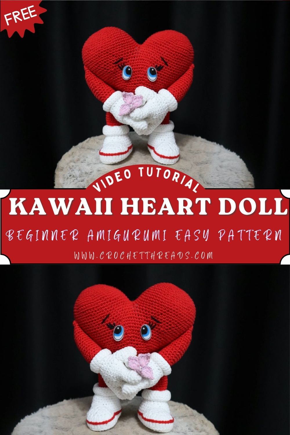 This kawaii heart doll is more than a plush heart: it has personality. The heart-shaped body gives it a playful silhouette, while the cute facial expression adds warmth. Little arms reach forward, glove-like hands hold a small decorative detail, and simple boots complete the doll as a character. This project suits beginners who know basic stitches and want a friendly challenge with shaping, plus it’s a lovely handmade decor piece for shelves, desks, or gift baskets.