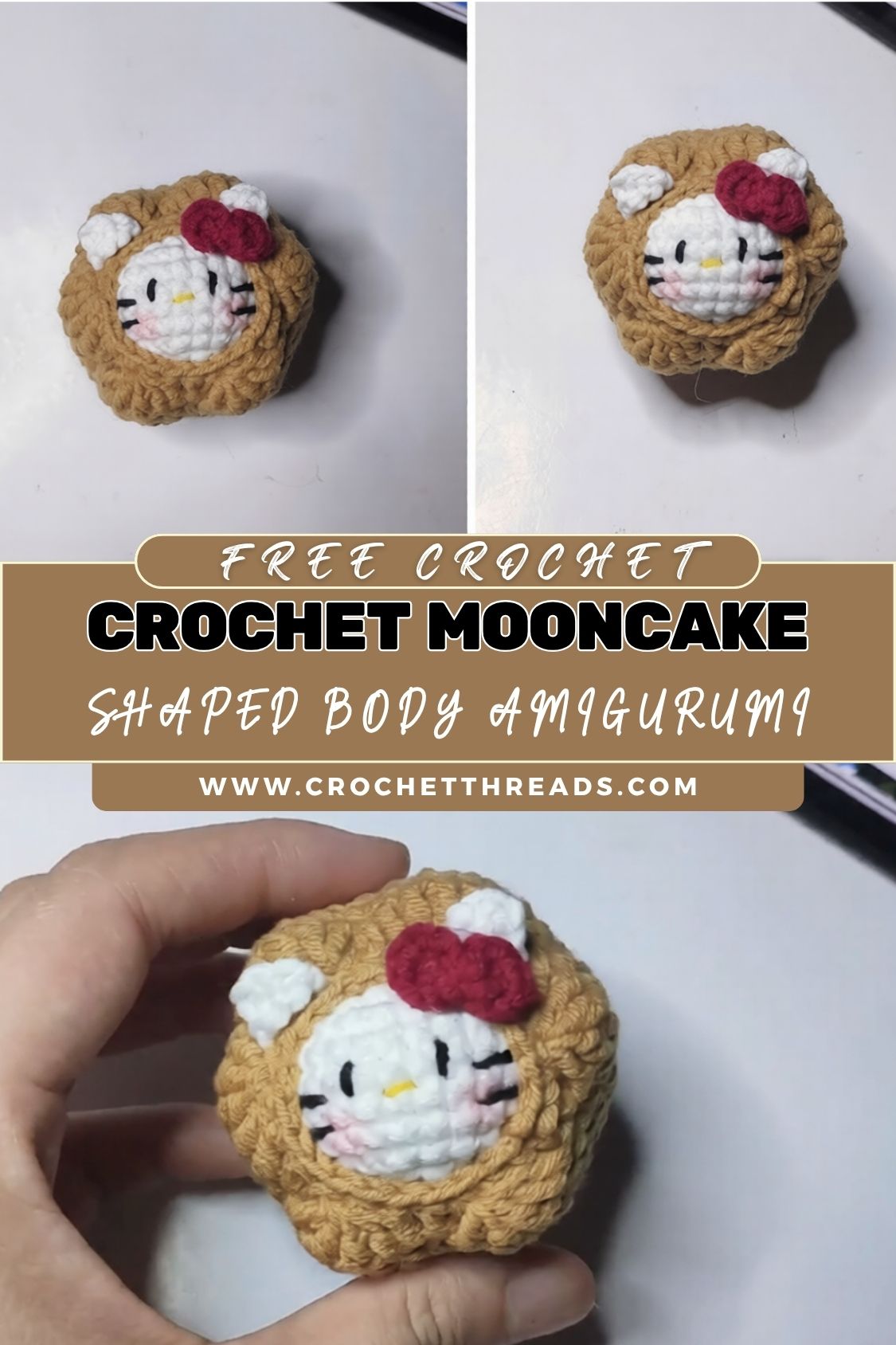 This crochet amigurumi pattern focuses on clean, simple shapes: a ball-like head, small ears, and a flattened, rounded “mooncake” body that looks like a cute dessert bun. The charm comes from the details, embroidered cheeks, tiny mouth, safety eyes (optional), and embellishments like a bow or colorwork accents.