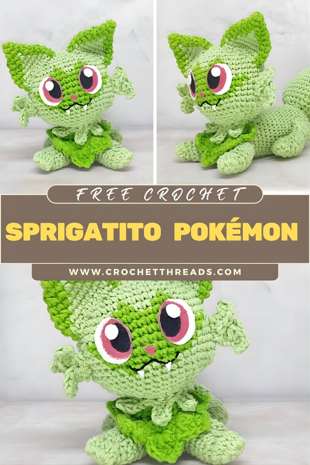 Looking for a fun crochet Pokémon project that’s cute, giftable, and beginner-friendly? Save this crochet Sprigatito plush tutorial and make your own Pokémon-inspired amigurumi cat! This step-by-step Pokémon crochet pattern shows how to crochet the head and body, stitch perky ears with dark green accents, add tiny legs, and shape a thick, curved tail. The best part is the leafy neck collar,r an easy detail that makes the finished crochet plush toy instantly recognizable and extra adorable.
