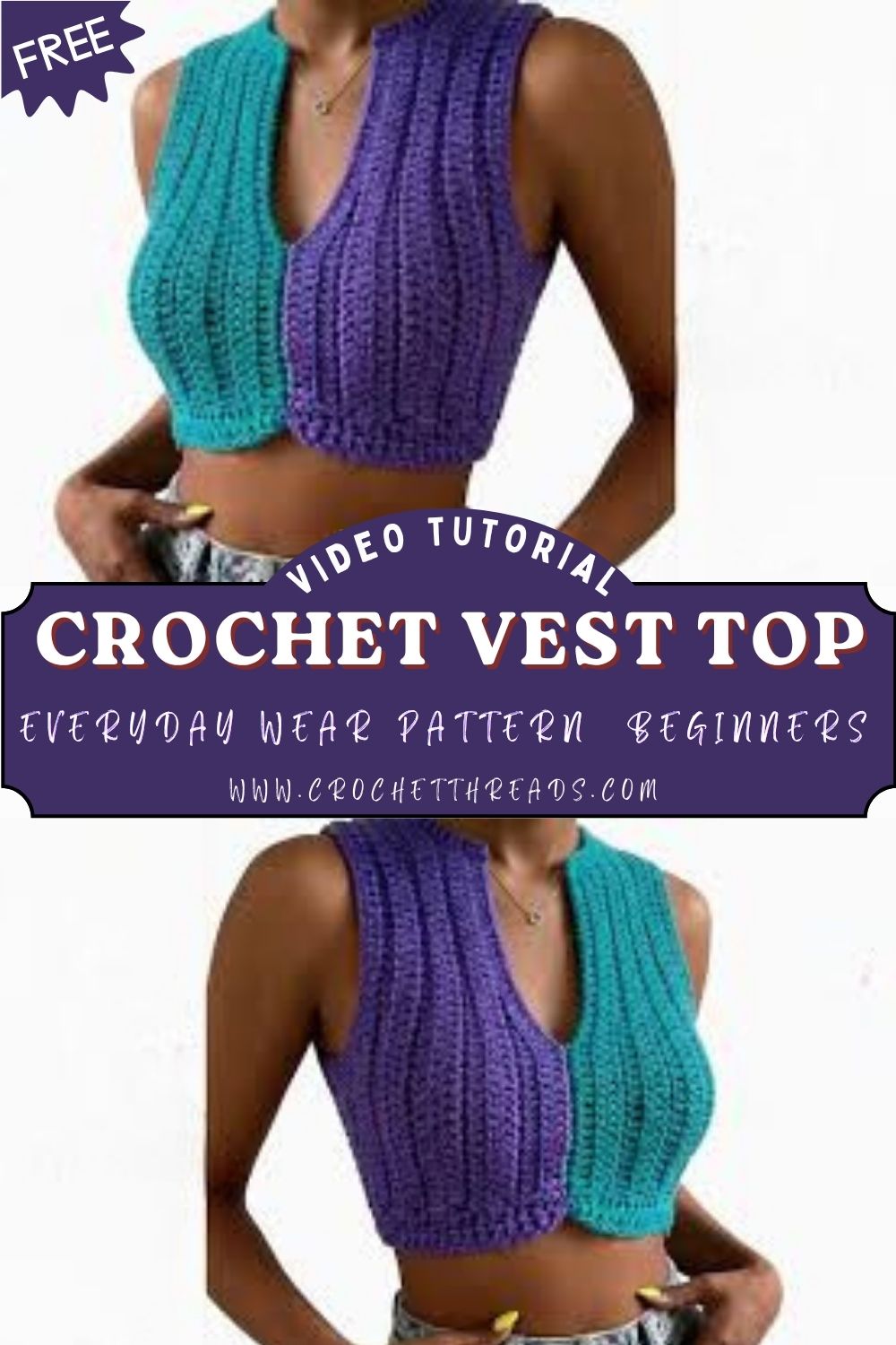 A ribbed crochet vest top like this is the kind of project that feels satisfying from start to finish: easy stitches, quick progress, and a final look that fits right into modern crochet fashion. The deep V-neckline, cropped shape, and purple-and-teal color blocking give it trendy, handmade vest-top energy while remaining comfortable enough for easy everyday wear. Grab two colors you love, take them panel by panel, and enjoy wearing something you made with your own hands.